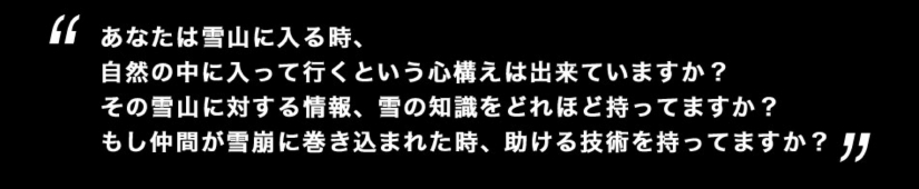 谷川岳は、本作のタイトル通り雪崩の頻発する山です。どの雪山でも滑るには、滑走技術が必要不可欠ですが、その前に山岳ライディングでは、まず ”心構え”・”知識”・”経験” の3つが必要です。自然の雪山に入り、もし何かが起こった場合、自分たちでその問題を解決しないといけません。雪山ではすべてが自己責任だからです。谷川岳ではこの3つを、高いレベルで身につけていないと、自分と仲間の命を危険にさらすことになります。日本でも数ある”雪崩の山”のひとつである、谷川岳の撮影を進めて行くうちに、この3つは、谷川岳以外の雪山を滑る時でも絶対的に重要な事であって、これは本作のテーマになると考えるようになりました。