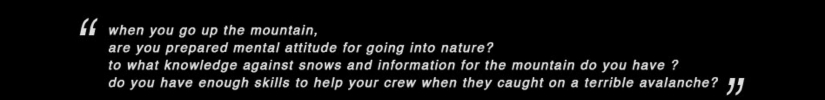 as the title, Mt. Tanigawa-dake is the mountain where occurs frequent avalanche. to drop in any snow mountain it’s essential of snowboarding skills, mountain riding before, we need to having three things of “experience", "knowledge”and “mental attitude”. we need to solve some troubles on our own if something accident happened in the nature snow-mountain. it always self-responsibility in the snow-mountain. you will be endangering the lives of "fellow and yourself”if you do NOT acquire high-level skills these three. while through the shooting in one of the “an avalanche mountain” Mt. Tanigawa-dake, these three are absolutely important for us to ride in the snow-mountain even except Mt. Tanigawadake, so i thought this things will be the theme of this project.