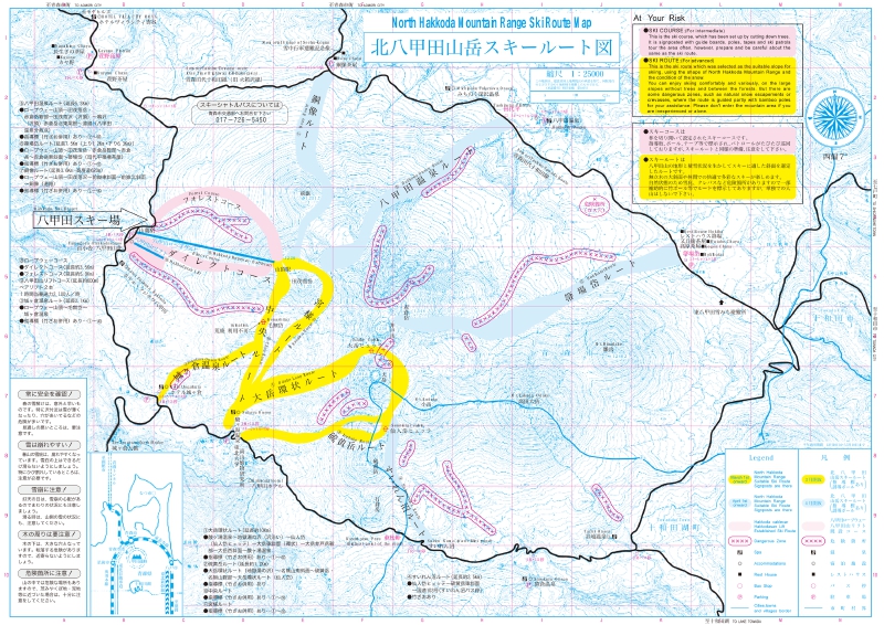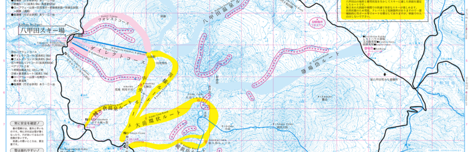 八甲田山は山岳ライディングを主な楽しみとする山です。初めて来た人でも滑れる、ポールがありコースを誘導してくれるのが、フォレストコース・ダイレクトコースになります。始めはこれでコースなの?とびっくりするでしょう。その他のルートは山岳ライディングです。コースを知っている人や、八甲田山 山岳ガイドと一緒に行動して、楽しむことをお勧めします。ついているラインの後追いはしないように。そして、危険箇所には入らないようにお願いします。